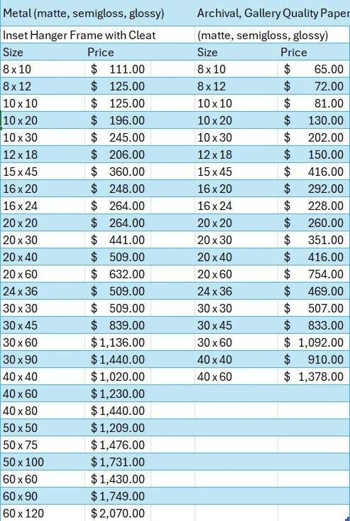 Also, custom sizes are possible. If you don’t see it in the chart communicate to find out what can be done. When determining a custom size it is helpful to know how long you want the image. Fragile Light can calculate the shorter side so the entire image is replicated.